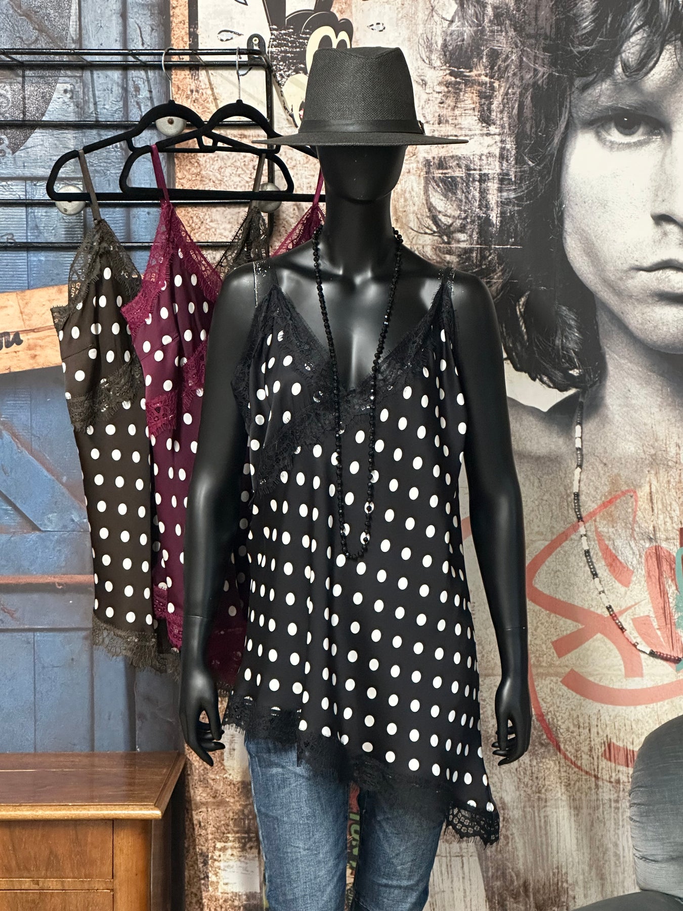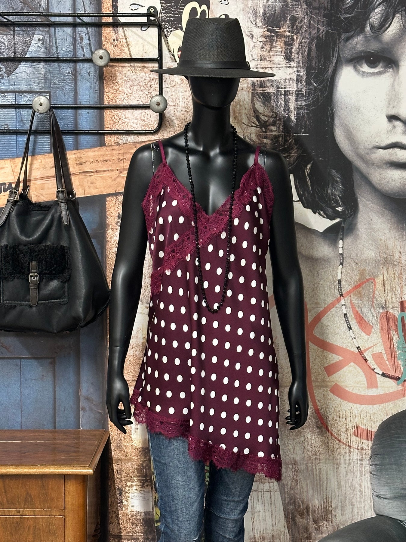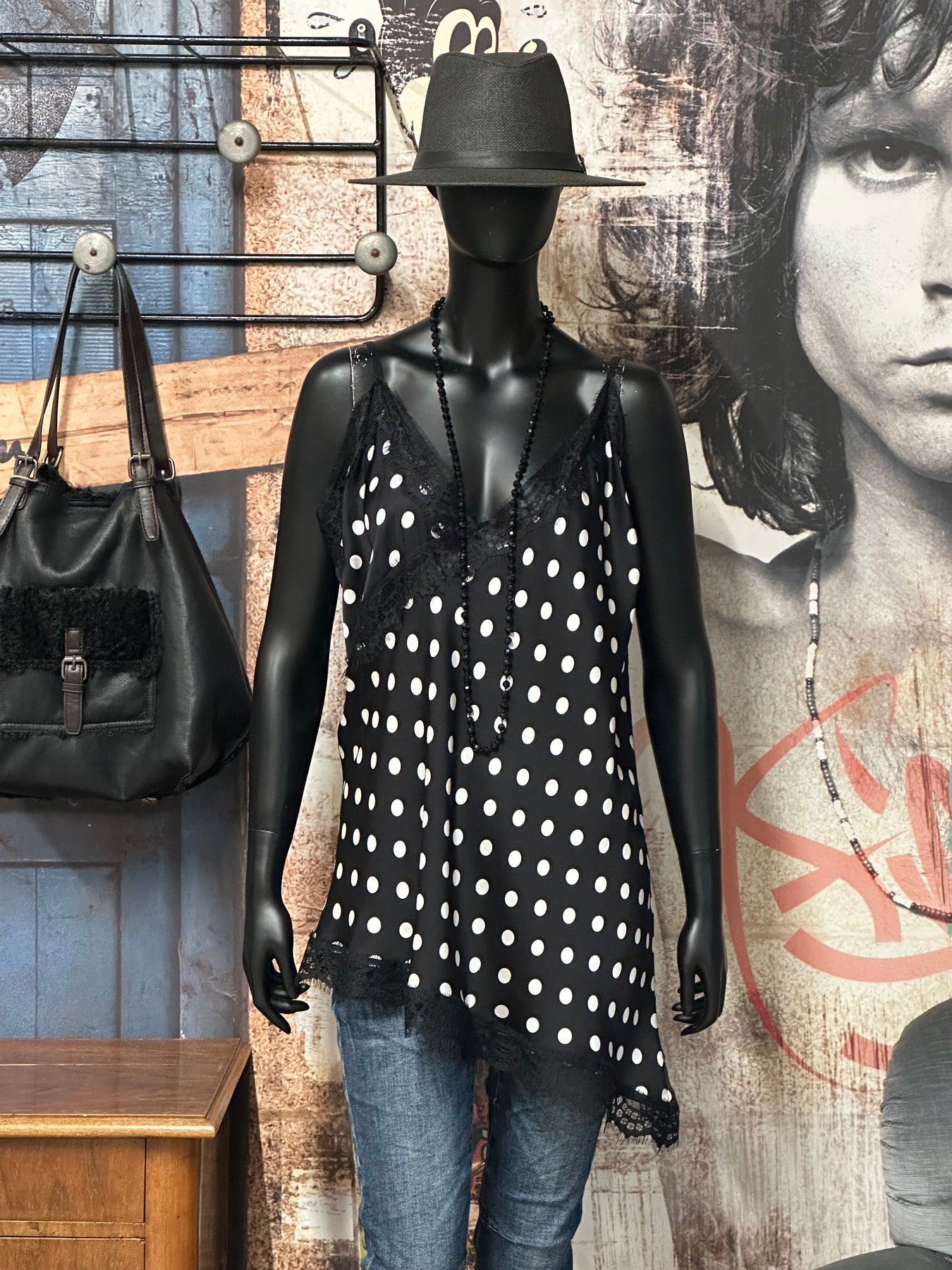 Dies ist nicht einfach nur ein Oberteil, es ist das Herzstück, das jeden Look verwandelt, von lässig elegant bis raffiniert. Asymmetrischer, lockerer Schnitt. Wunderschönes, zeitloses Muster mit weißen Punkten, das ihm einen Hauch von Retro-Chic verleiht. Wunderschöne Spitze am Kragen und am Saum. Sehr femininer V-Ausschnitt. Mit schmalen, verstellbaren Trägern, die sich jeder Figur anpassen. Der Rücken ist mit einem dezenten Gummiband versehen, das für mehr Bequemlichkeit und Komfort sorgt. Ideal für Partys, romantische Abendessen oder um Ihrem Alltagsoutfit einen Hauch von Glamour zu verleihen. Tragen Sie es unternter einem Strickpullover oder einem Oversize-Blazer und einer Jeans für einen unglaublichen Look.