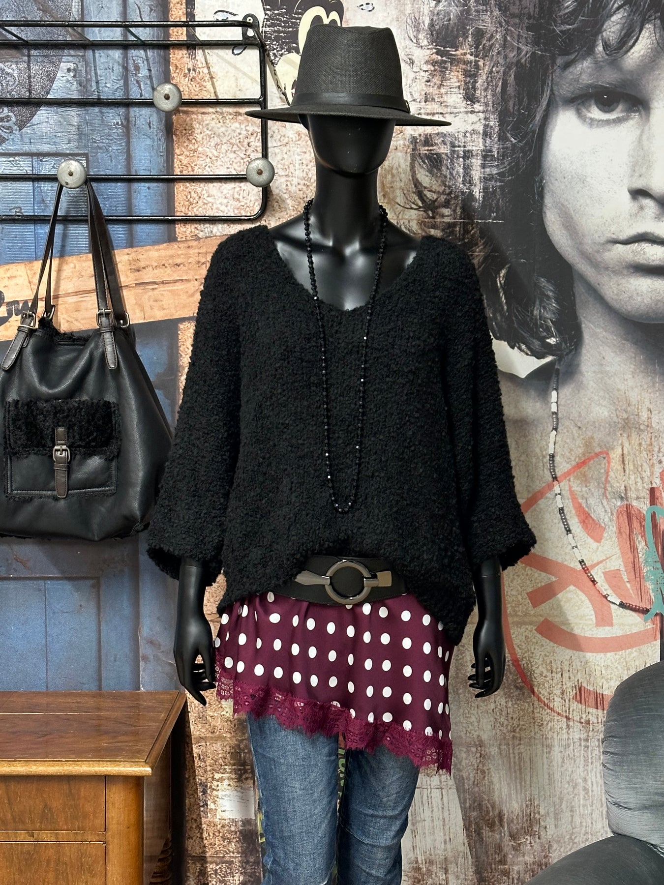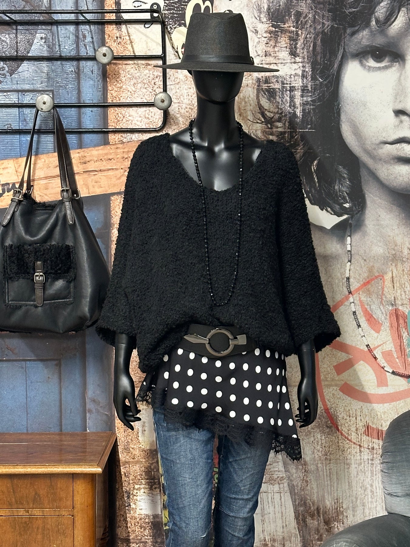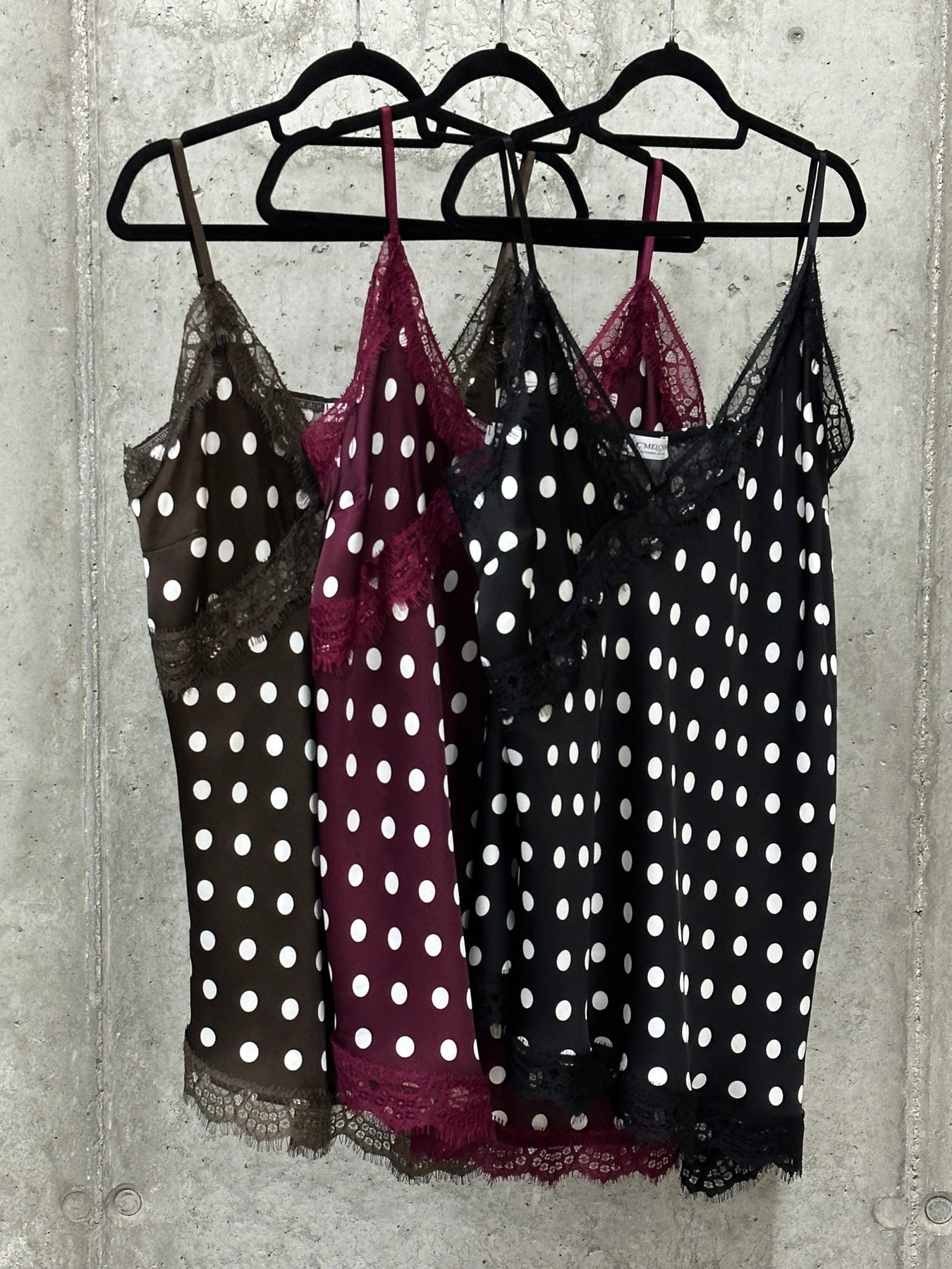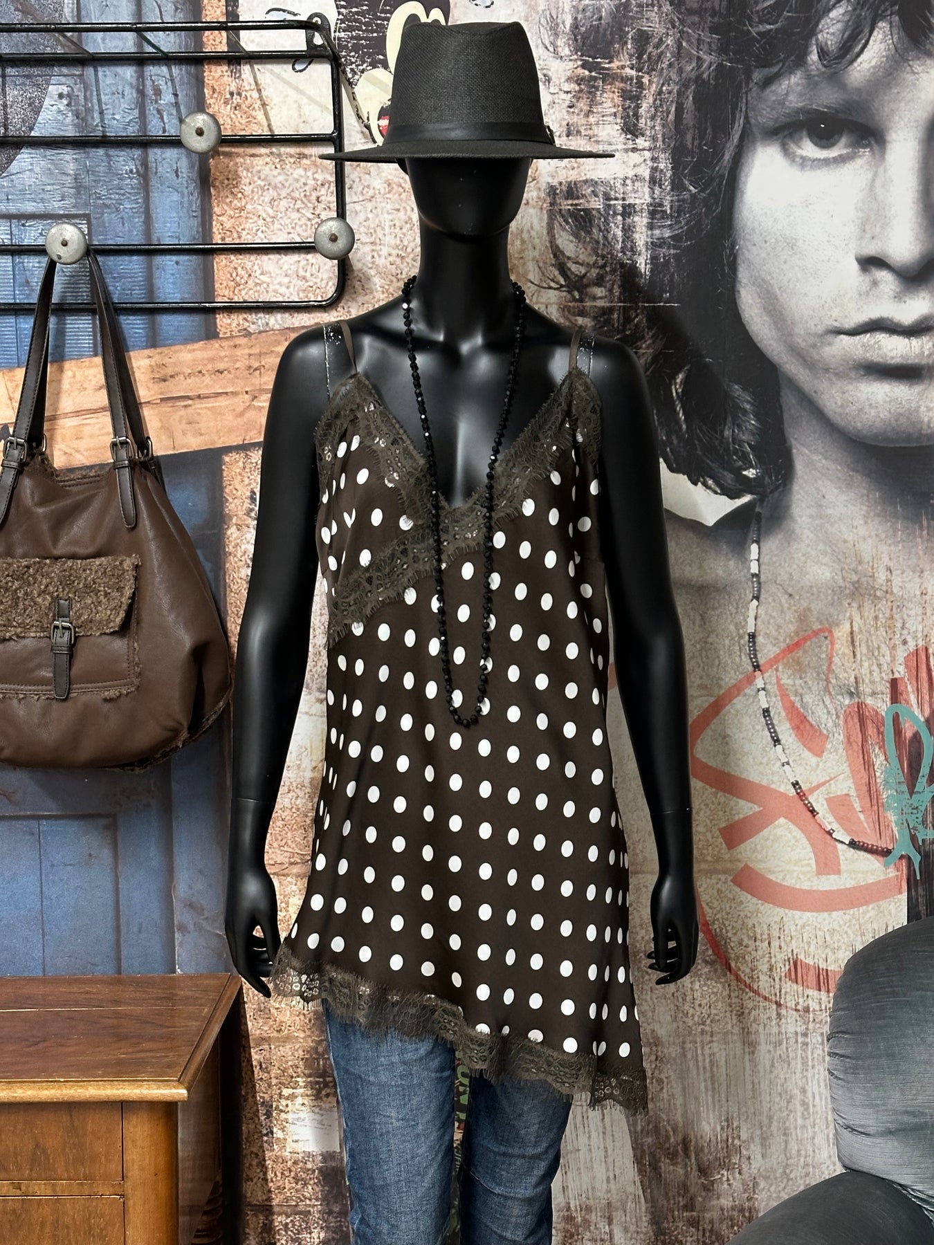 Dies ist nicht einfach nur ein Oberteil, es ist das Herzstück, das jeden Look verwandelt, von lässig elegant bis raffiniert. Asymmetrischer, lockerer Schnitt. Wunderschönes, zeitloses Muster mit weißen Punkten, das ihm einen Hauch von Retro-Chic verleiht. Wunderschöne Spitze am Kragen und am Saum. Sehr femininer V-Ausschnitt. Mit schmalen, verstellbaren Trägern, die sich jeder Figur anpassen. Der Rücken ist mit einem dezenten Gummiband versehen, das für mehr Bequemlichkeit und Komfort sorgt. Ideal für Partys, romantische Abendessen oder um Ihrem Alltagsoutfit einen Hauch von Glamour zu verleihen. Tragen Sie es unternter einem Strickpullover oder einem Oversize-Blazer und einer Jeans für einen unglaublichen Look.