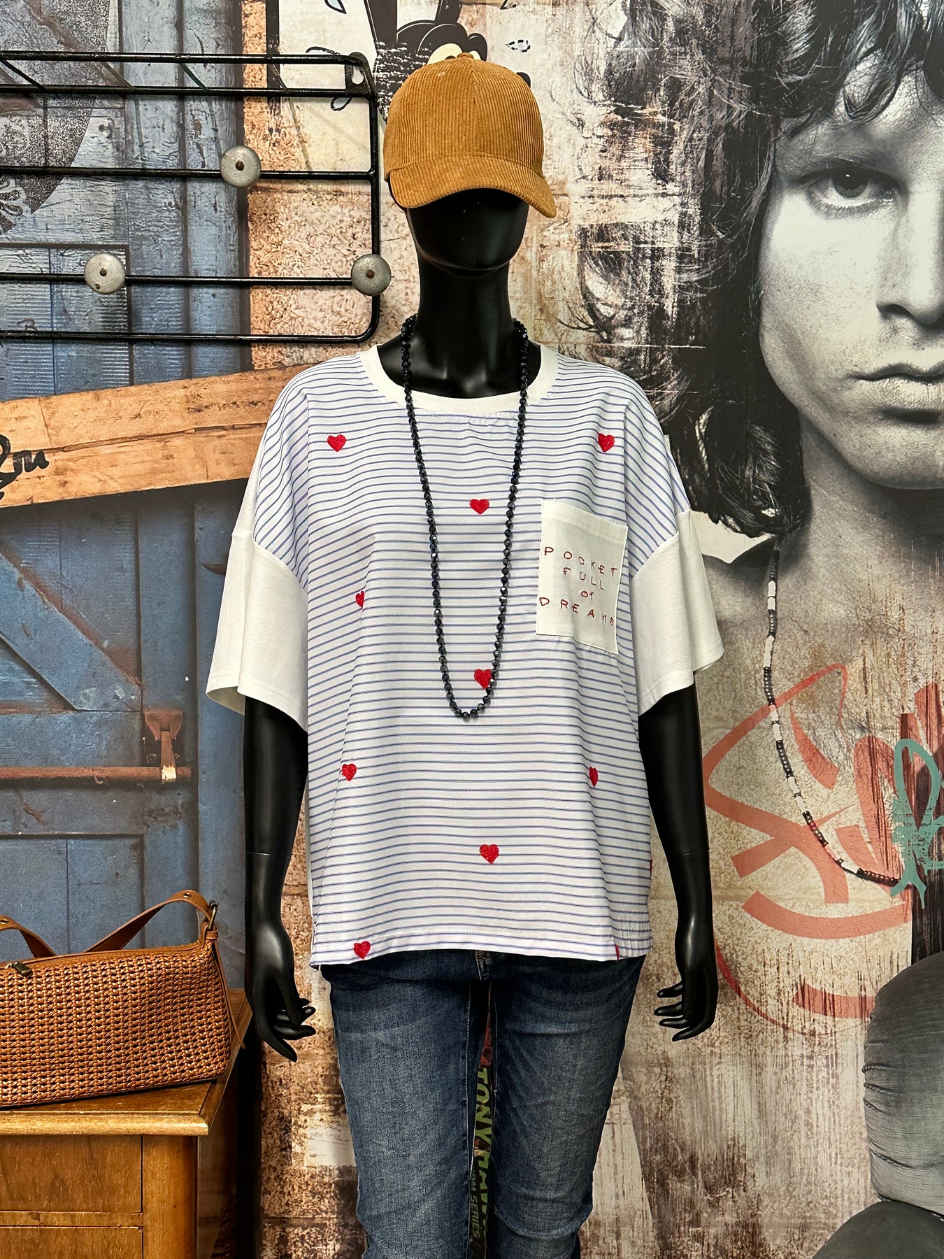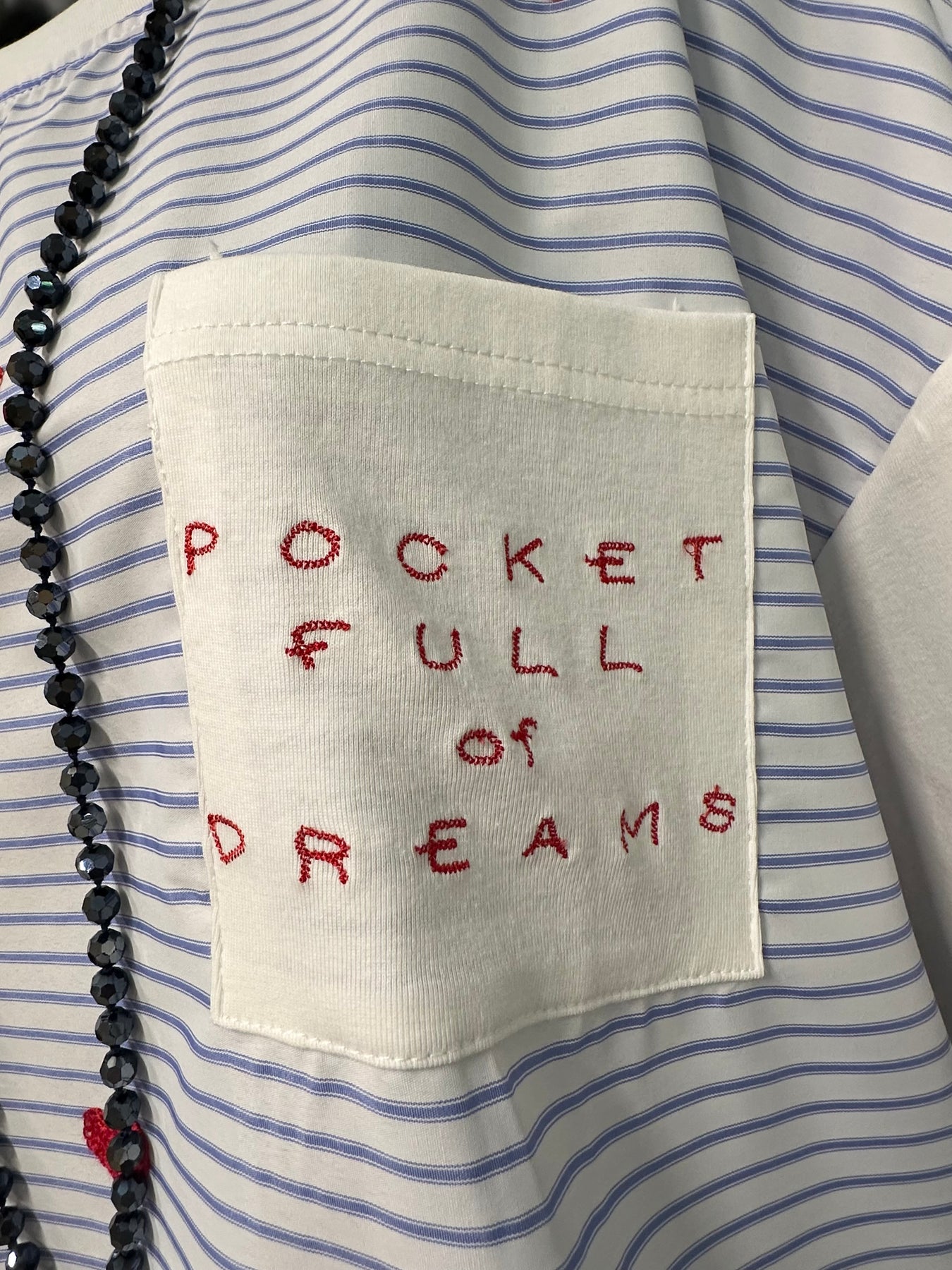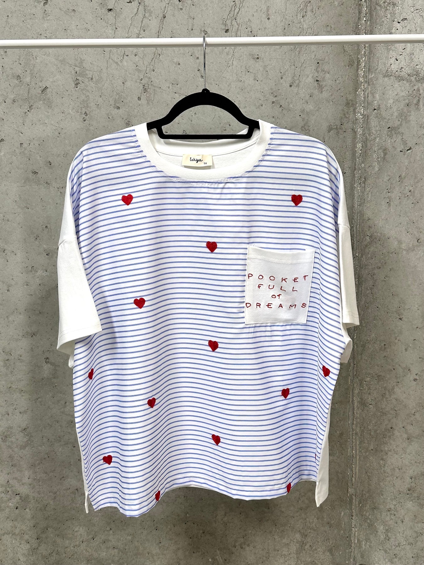 Weite, gerade Passform. Rundhalsausschnitt, der eng am Hals anliegt. Eine harmonische Mischung aus feinen blauen und weißen Streifen auf der Vorderseite, kontrastiert durch einen Rücken und Ärmel in strahlendem, reinem Weiß. Mit kleinen, reliefartig gestickten roten Herzen verziert, die für einen Hauch von Farbe und Sanftheit sorgen. Eine aufgesetzte Brusttasche mit der gestickten Aufschrift: „POCKET FULL OF DREAMS“ (Eine Tasche voller Träume).