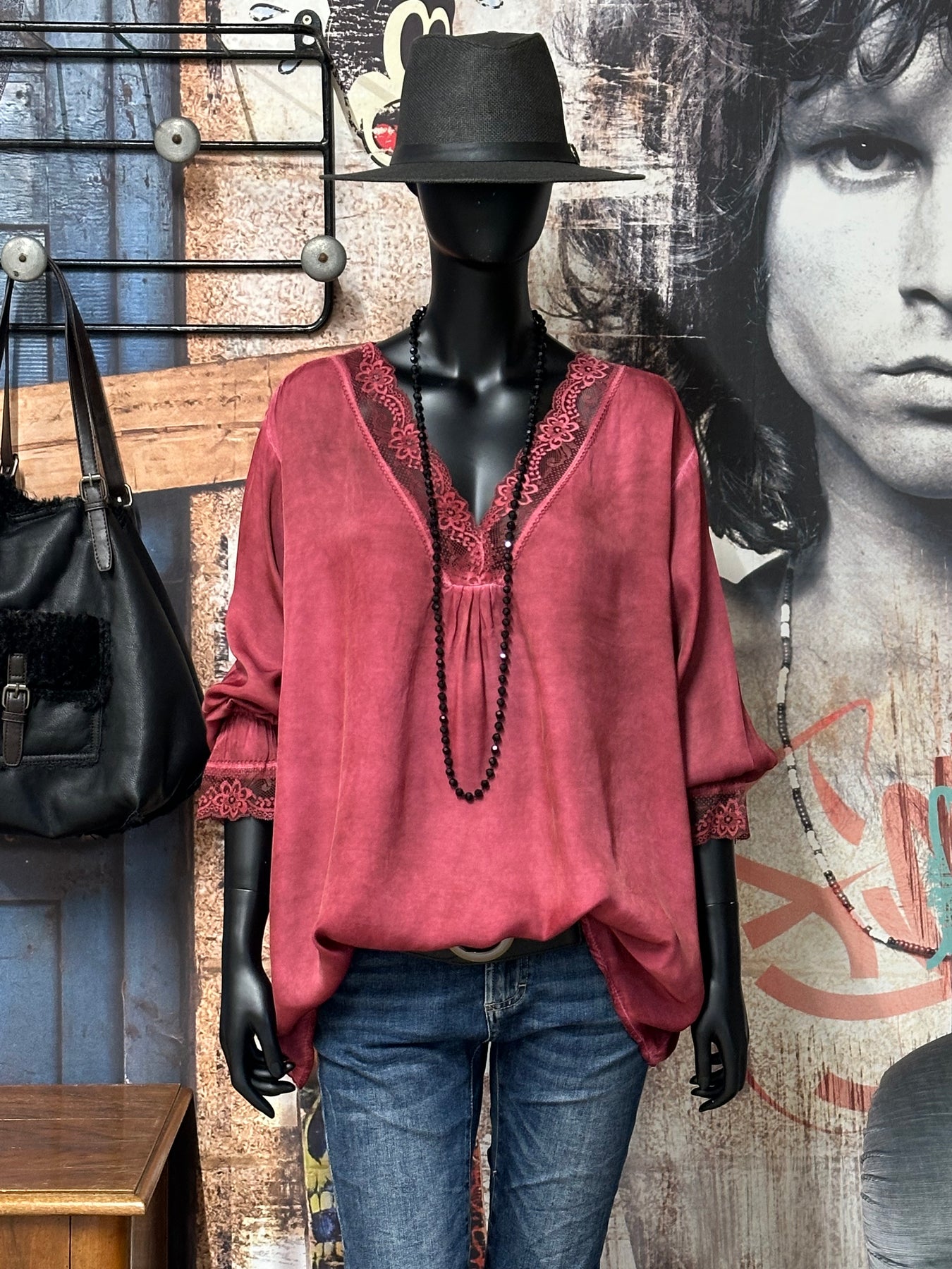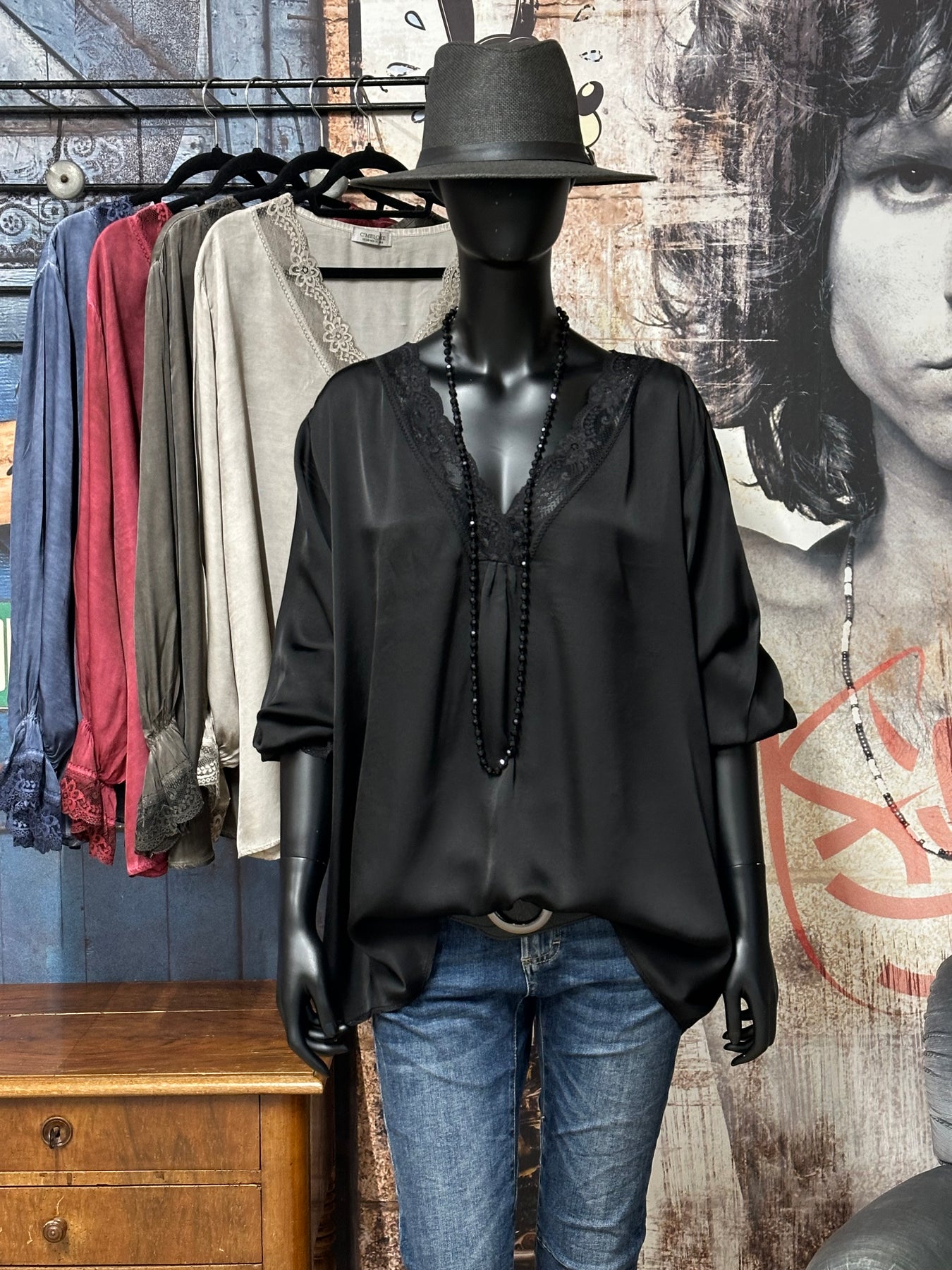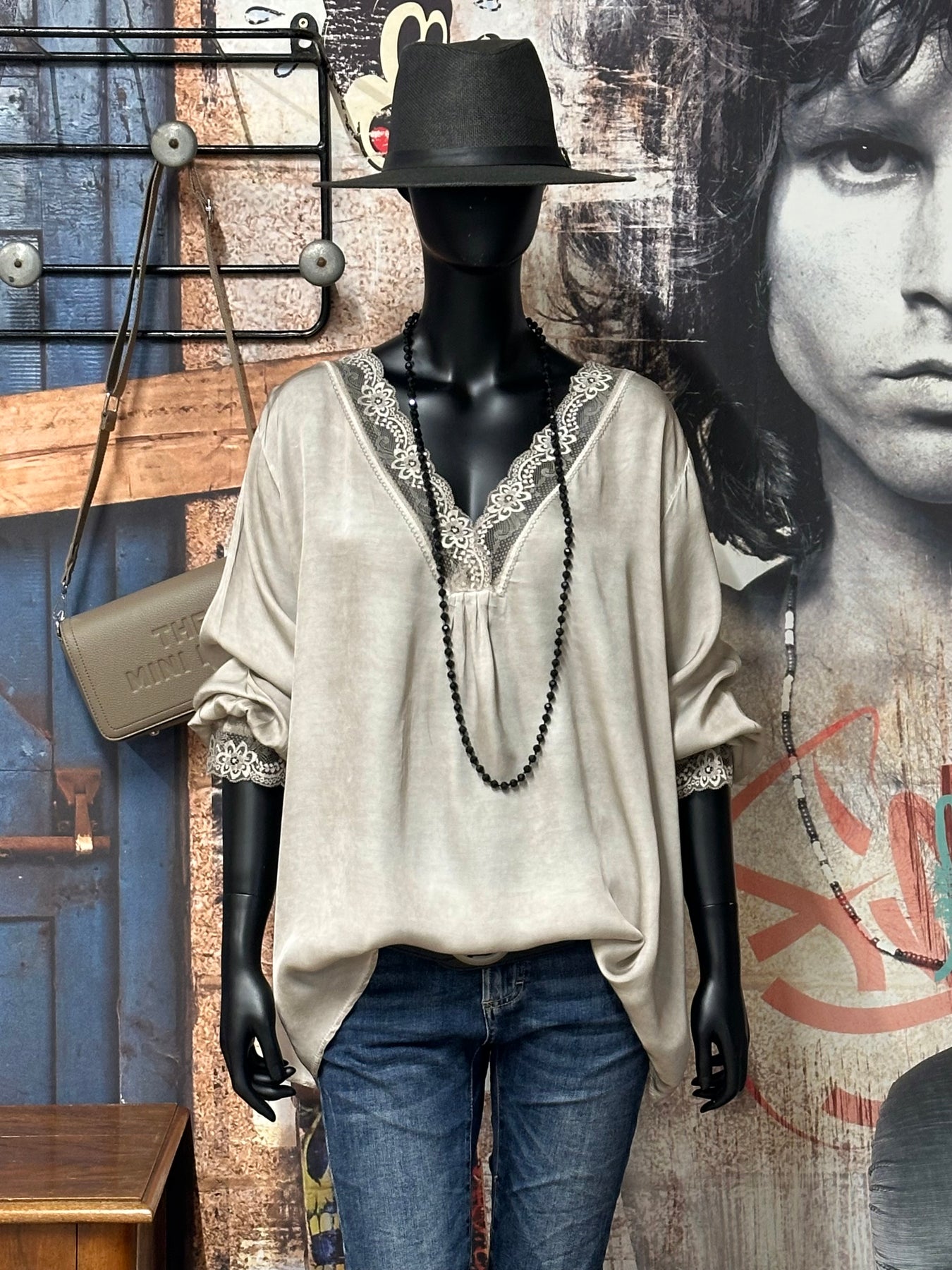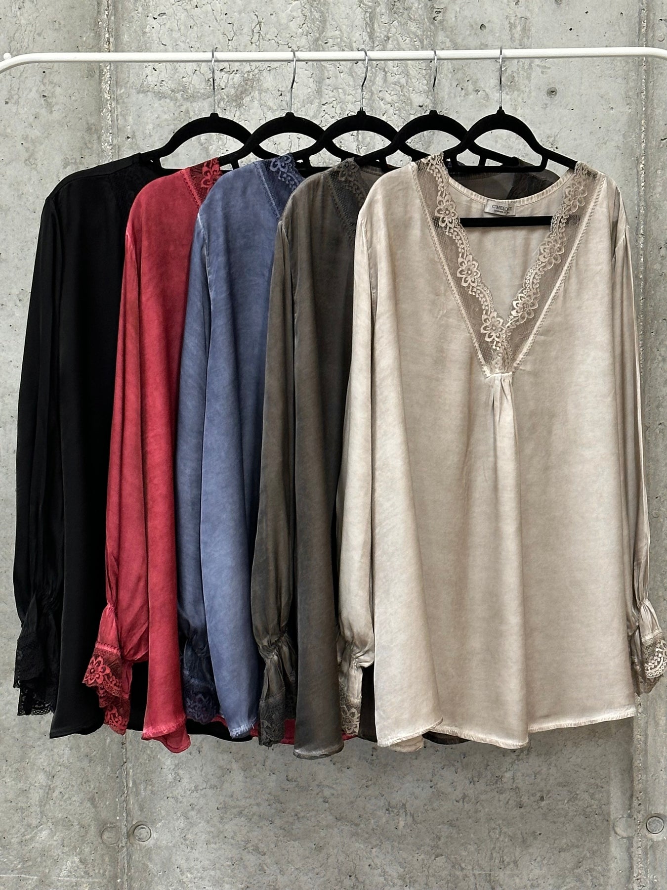 Ein Muss für jeden Kleiderschrank. Wunderschönes Spitzentop aus 100% natürlichem Material. Leicht satinierter Effekt und in Vintage-Farbe. Lange Ärmel mit Froufrou-Abschluss aus Spitze und Gummiband. Supersexy V-Ausschnitt. Gerader, übergroßer Schnitt. Ultra fließend für eine makellose Passform. Perfekt für einen Casual Chic oder einen Boho-Look. Dieses Oberteil lässt sich leicht mit einer Jeans für ein Alltagsoutfit oder mit einer Straßenhose oder einem Rock für einen formelleren Anlass kombinieren. Erhältlich in 5 Farben.