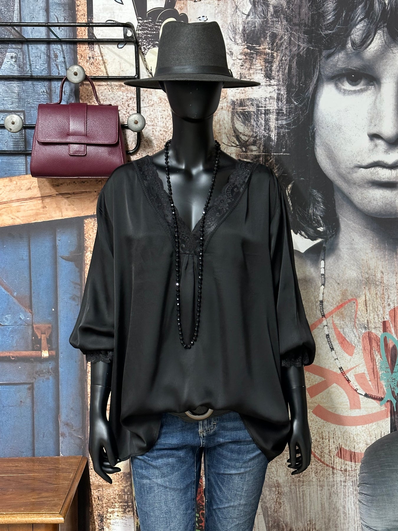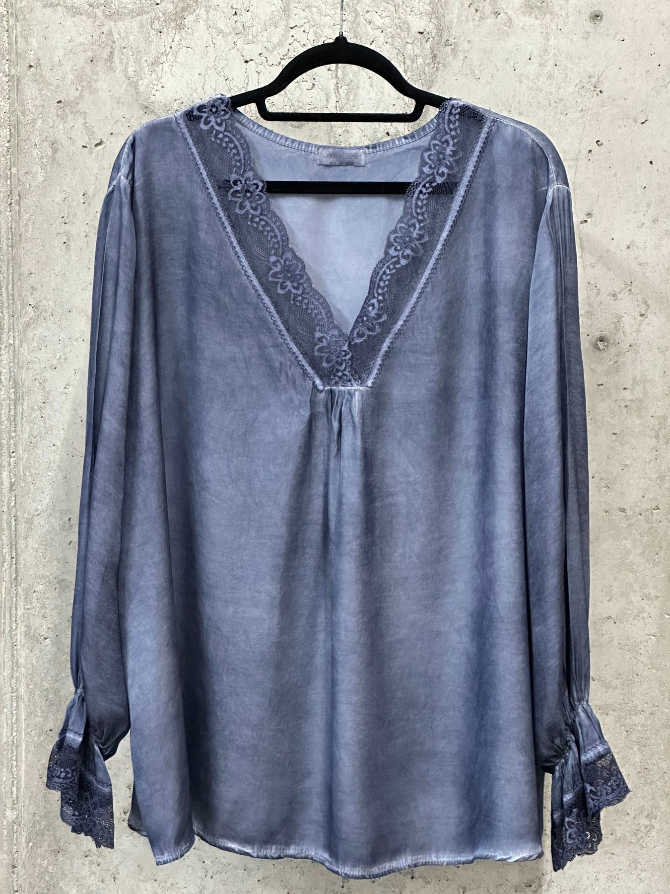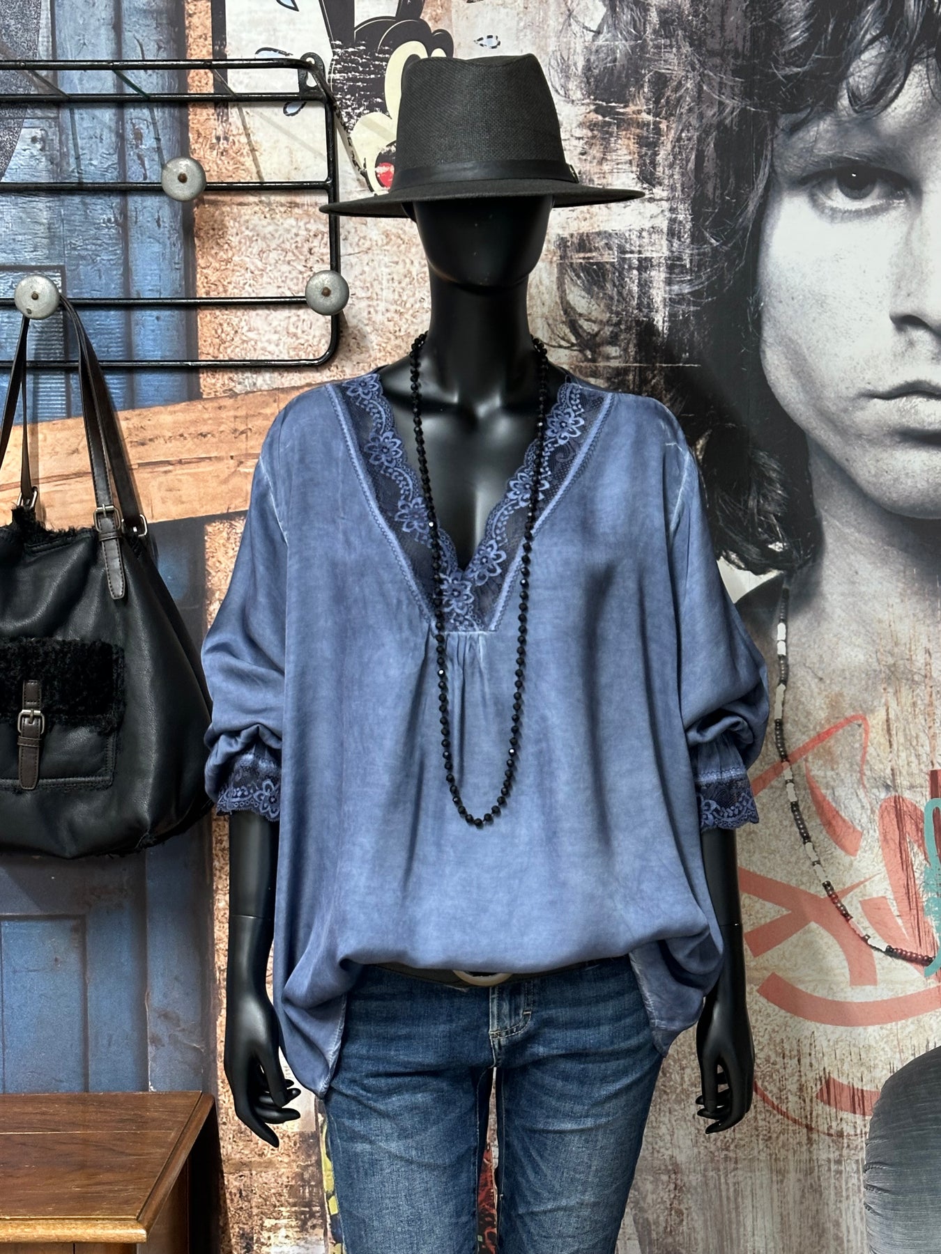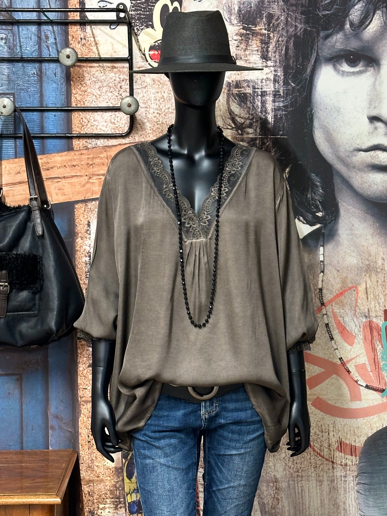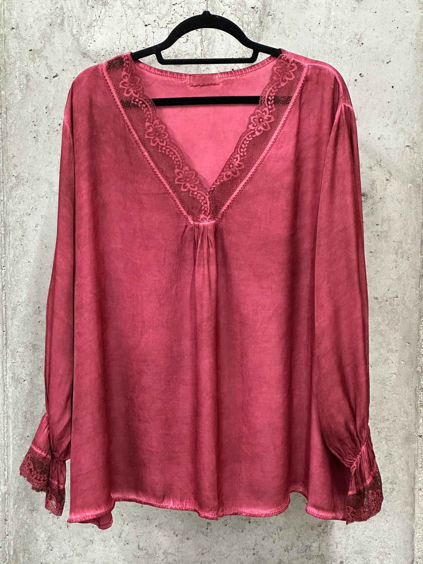Ein Muss für jeden Kleiderschrank. Wunderschönes Spitzentop aus 100% natürlichem Material. Leicht satinierter Effekt und in Vintage-Farbe. Lange Ärmel mit Froufrou-Abschluss aus Spitze und Gummiband. Supersexy V-Ausschnitt. Gerader, übergroßer Schnitt. Ultra fließend für eine makellose Passform. Perfekt für einen Casual Chic oder einen Boho-Look. Dieses Oberteil lässt sich leicht mit einer Jeans für ein Alltagsoutfit oder mit einer Straßenhose oder einem Rock für einen formelleren Anlass kombinieren. Erhältlich in 5 Farben.