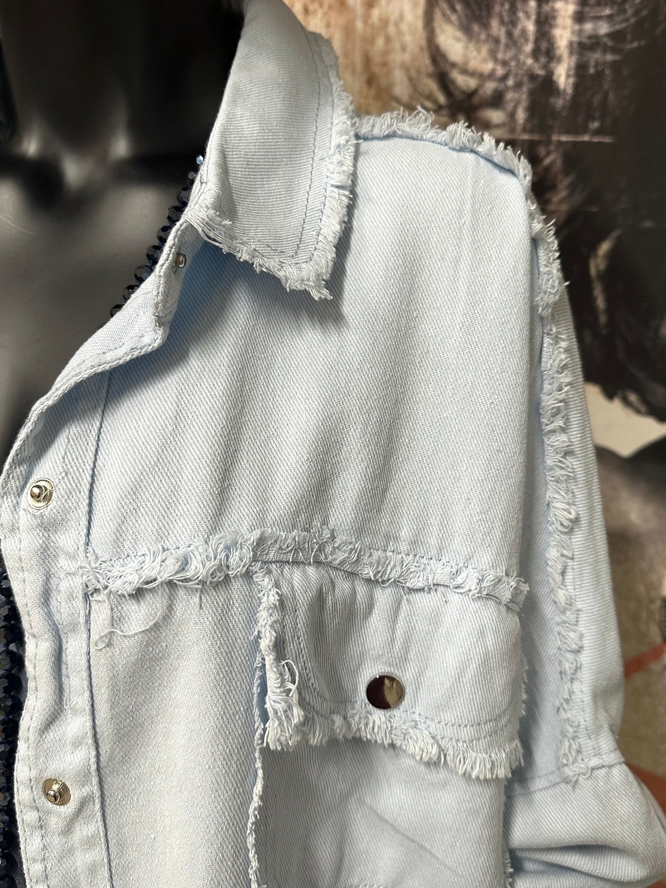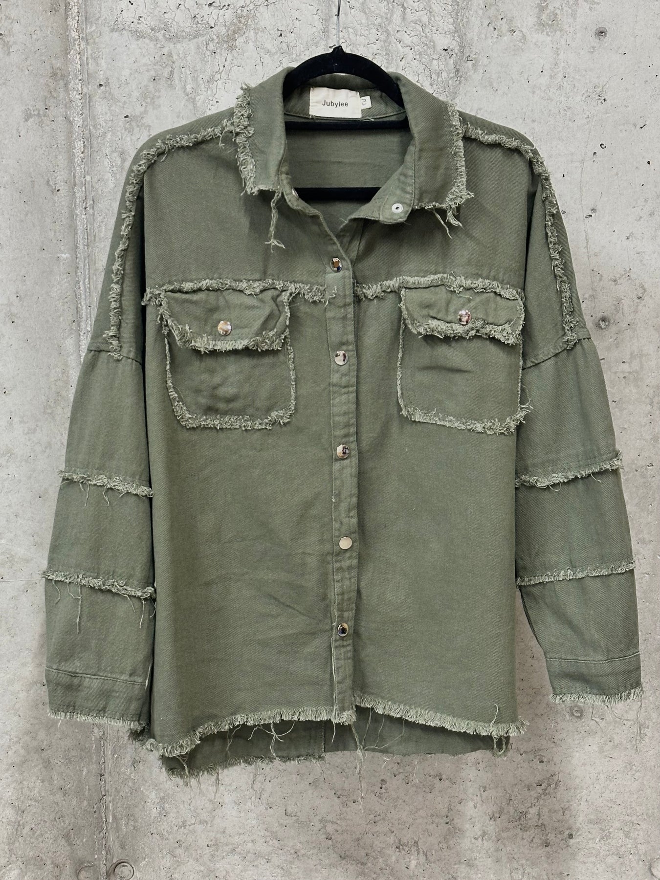 Gerader, weiter Schnitt. Verschluss mit robusten Metalldruckknöpfen und zwei großen, funktionalen Brusttaschen mit Patte.Ausgefranste horizontale Öffnungen an den Ärmeln sorgen für einen einzigartigen, destrukturierten Stil.Einsatz auf der Rückseite mit der Aufschrift „ROCK & ROLL” in Bouclé-Buchstaben, die für einen Hauch von Relief und Charakter sorgen. und zarte Fransen am Kragen, an den Taschen, entlang der Arme und am unteren Rand der Jacke sorgen für einen authentischen Bohemian-Rock-Look.