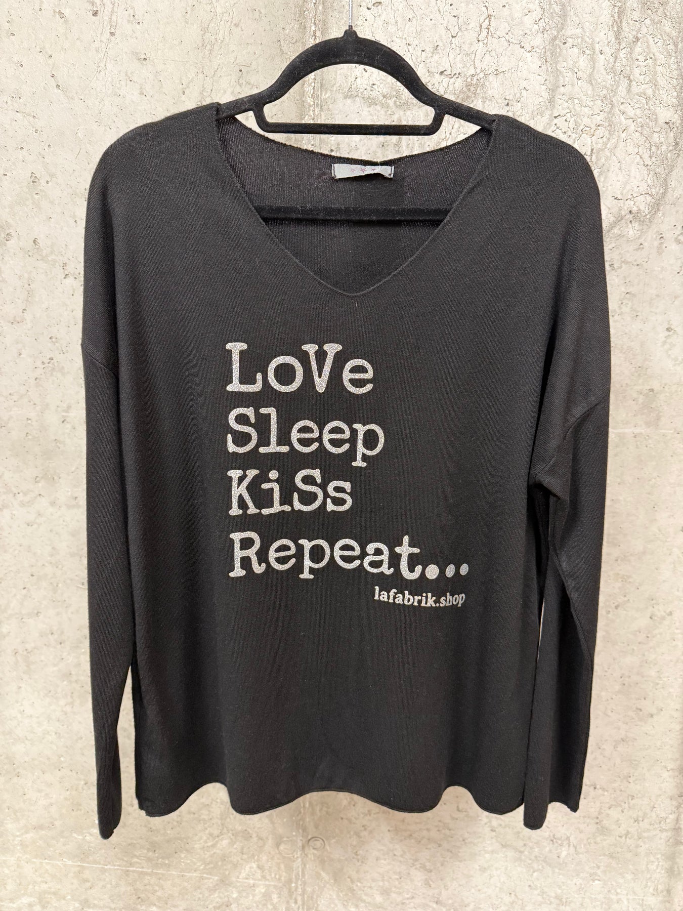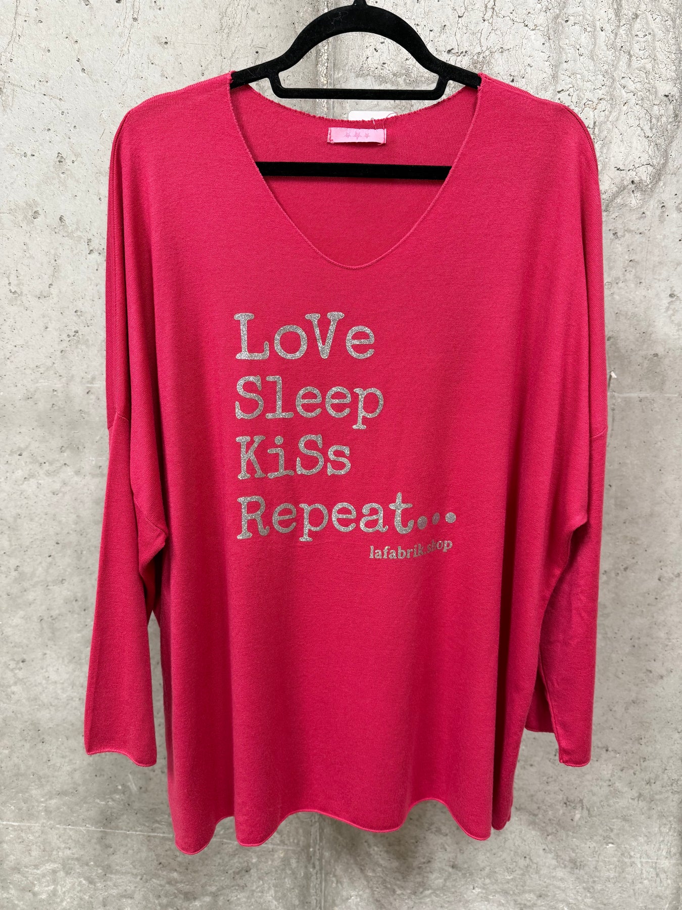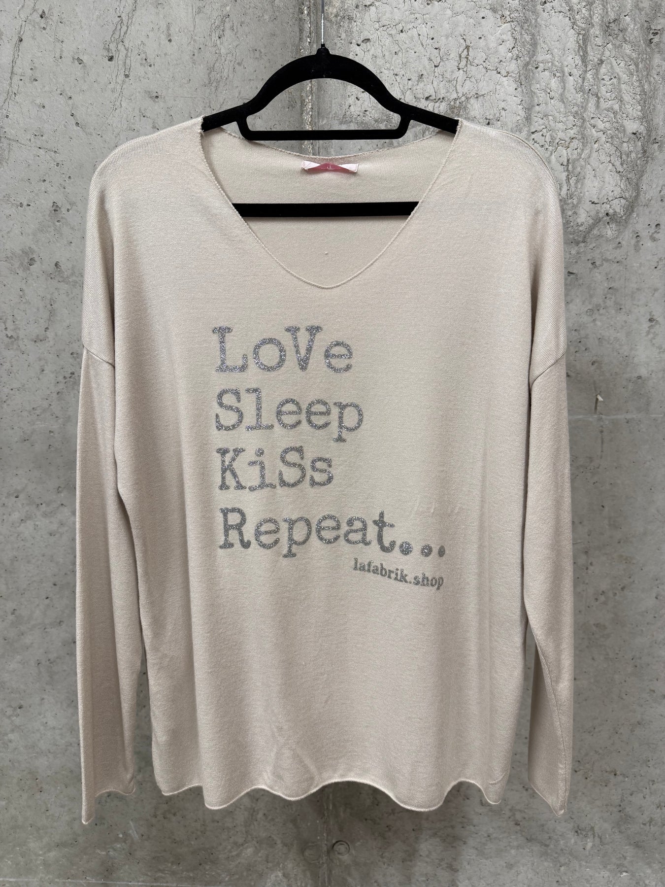 Verleihen Sie Ihrer Garderobe mit diesem superbequemen Pullover einen Hauch von Pep und Originalität. Weite, gerade Passform. Ultra-femininer V-Ausschnitt. Lange Ärmel mit leichtem Fledermaus-Schnitt. Silbermetallic-Schriftzug „Love, sleep, kiss…Repeat” Ein exklusives Modell von FABriK, das garantiert auffällt.