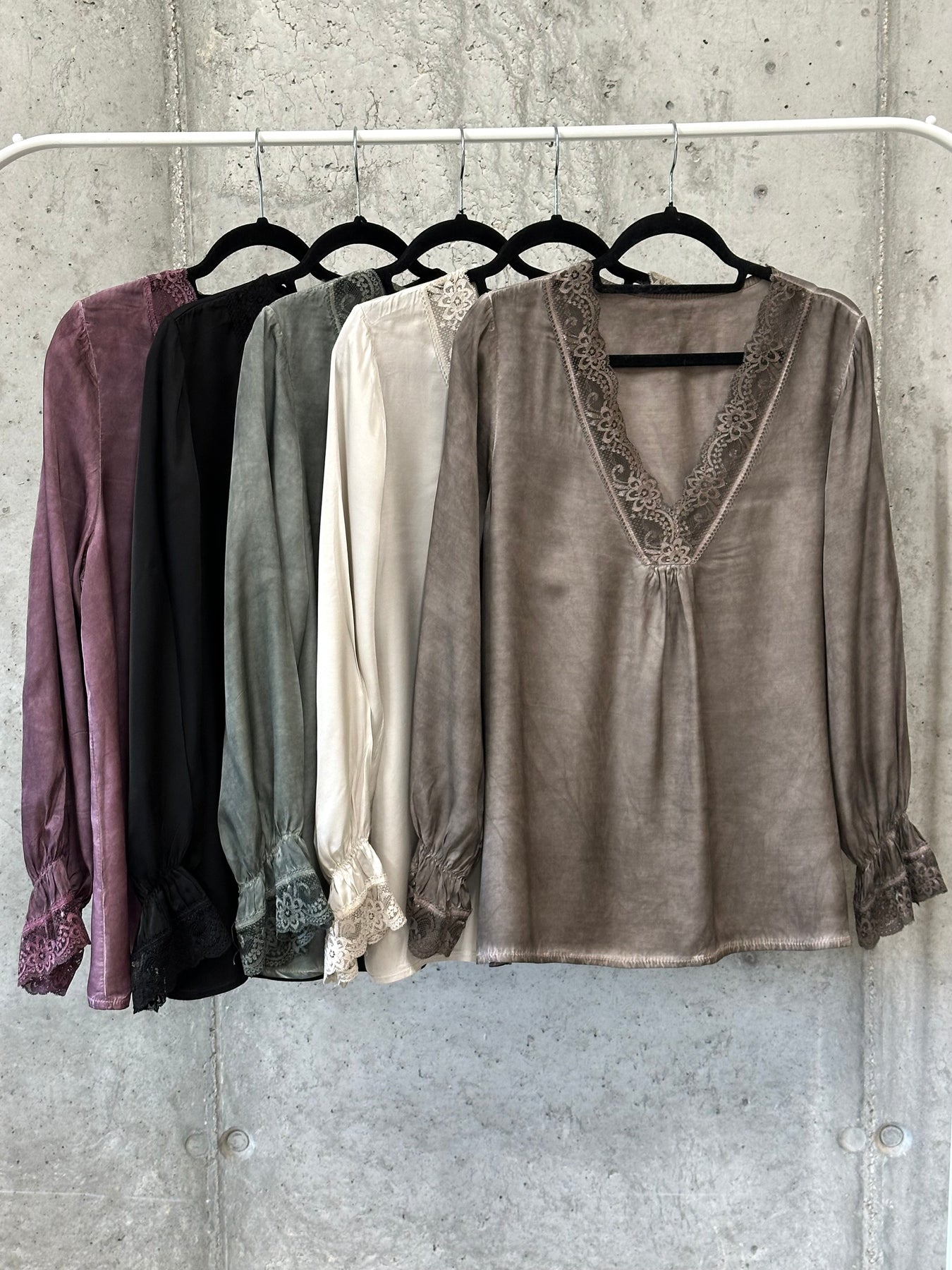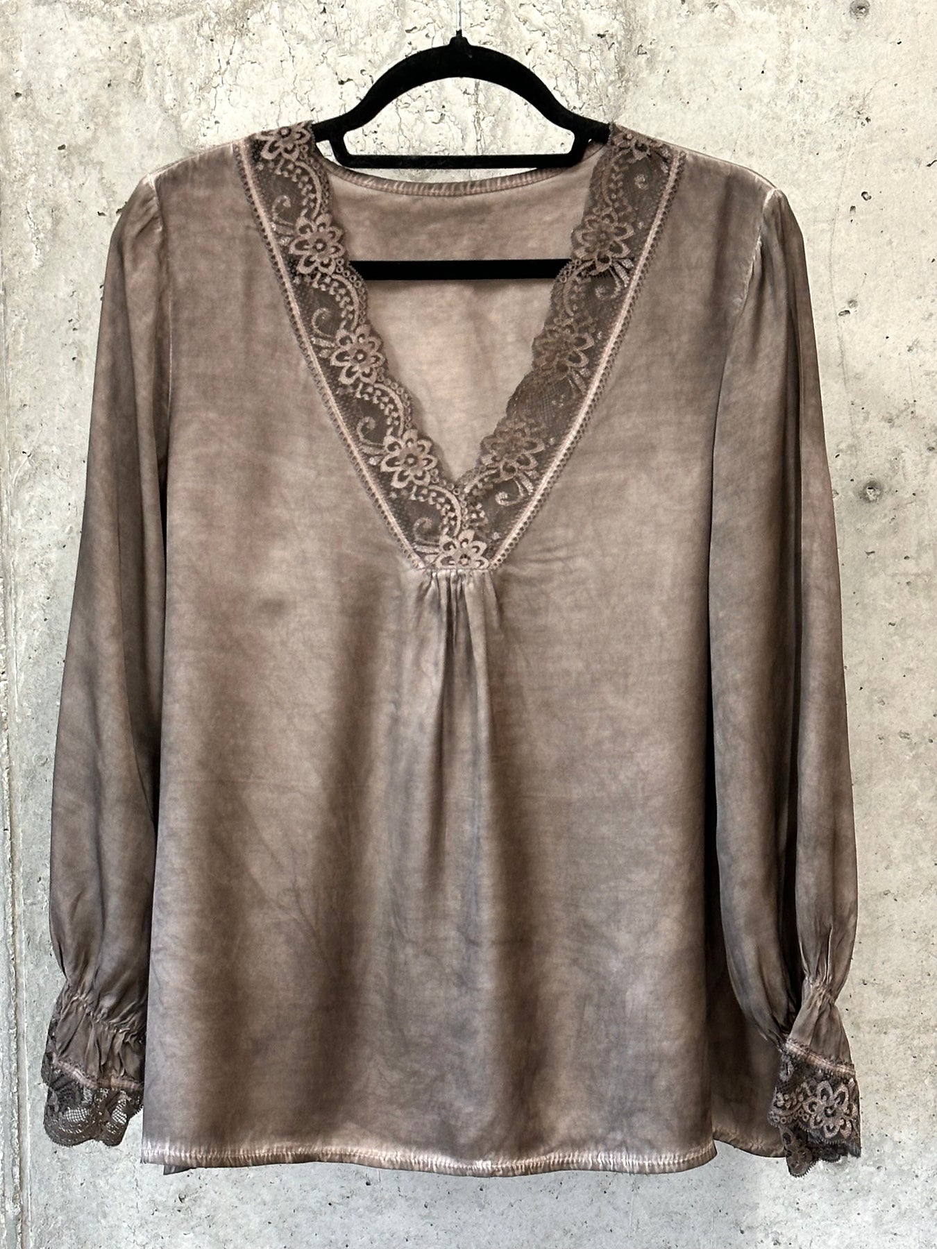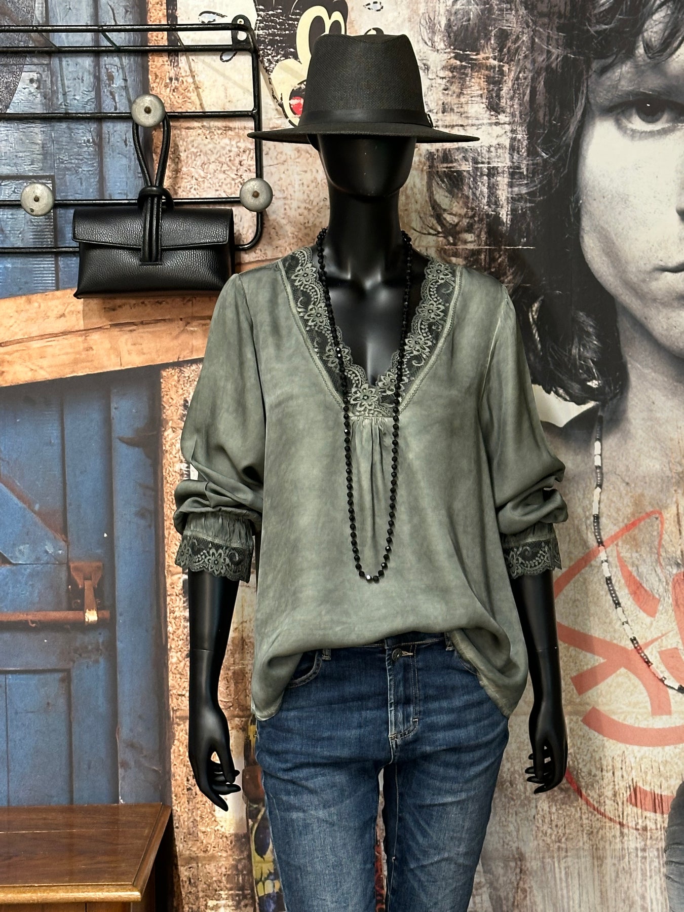 Lassen Sie sich von dem zarten Charme und dem Bohemian-Chic dieses wunderschönen Tops verführen. Es ist aus 100% fließender Viskose gefertigt und bietet optimalen Tragekomfort und einen eleganten Fall. Der V-Ausschnitt ist mit wunderschöner Spitze verziert, die dem Top einen sexy Touch verleiht. Lange Ärmel mit einem Spitzenbesatz an den Enden. Perfekt für einen Casual Chic oder einen Boho-Look. Dieses Oberteil lässt sich leicht mit einer Jeans für den Alltag oder mit einer Straßenhose oder einem Rock für einen formelleren Anlass kombinieren. Erhältlich in 5 Farben