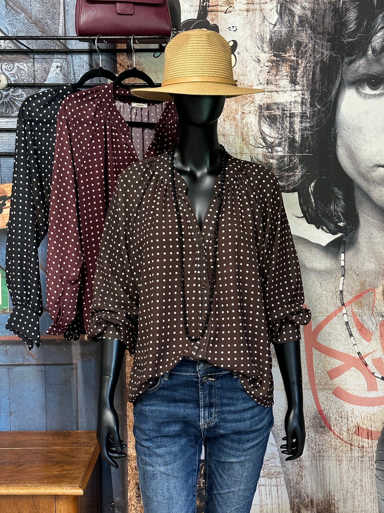 Lassen Sie sich von dieser sublimen, ultrafließenden Bluse verführen. Gerade geschnitten. Mao Kragen. Über die gesamte Länge geknöpft. Lange, leicht gepuffte Ärmel mit Knopfverschluss. Wunderschönes Muster mit "Punkten". Transparent an den Ärmeln und am Rücken, die Vorderseite ist mit einem Futter versehen. Perfekt für einen lässigen und eleganten Look. Erhältlich in 3 Farben.