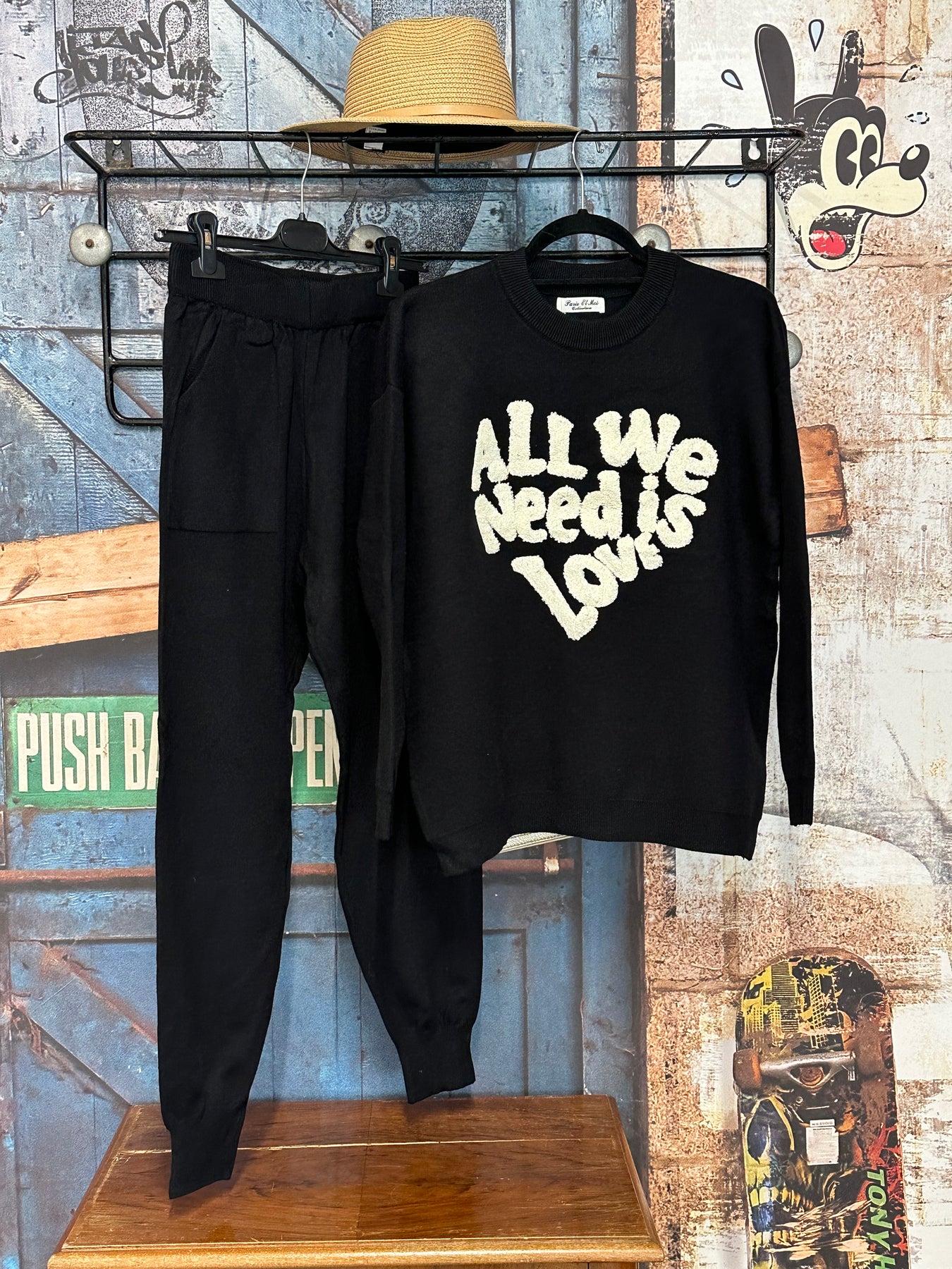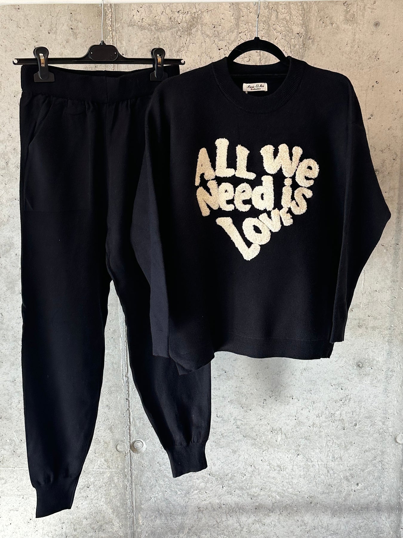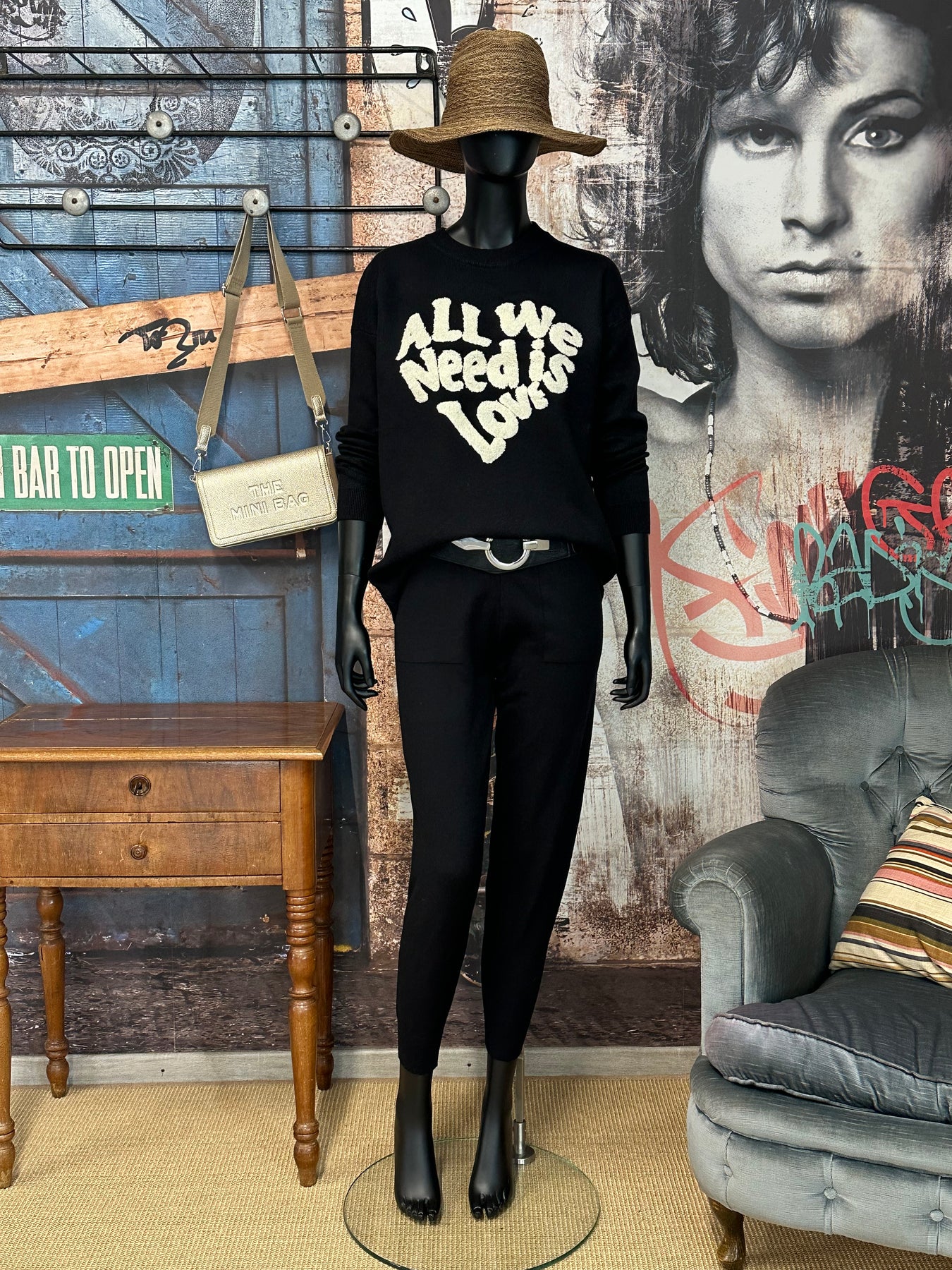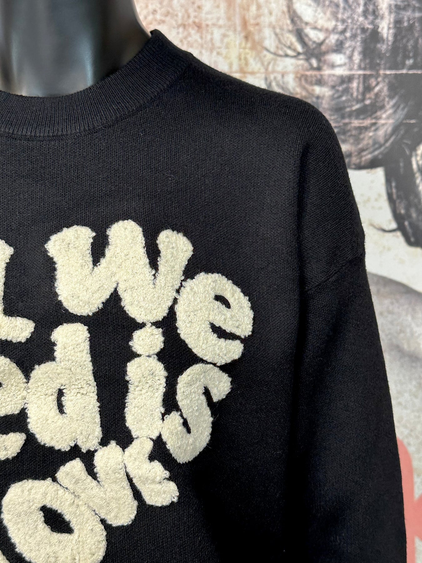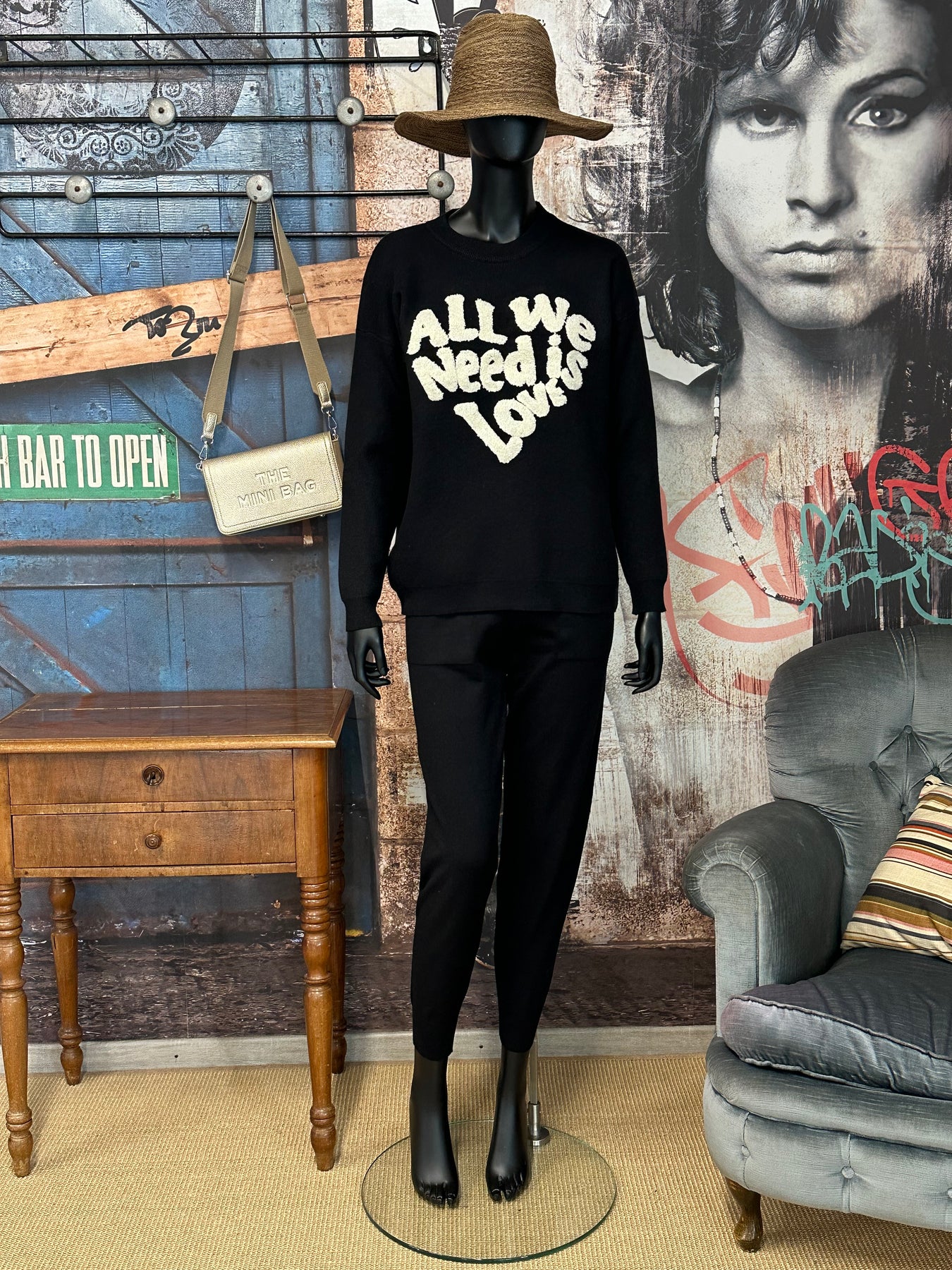 Der Pullover ist leicht oversized mit Rundhalsausschnitt und langen Ärmeln. Schöne Aufschrift „All we need is love” in Bouclé-Schrift und in Herzform auf der Vorderseite.