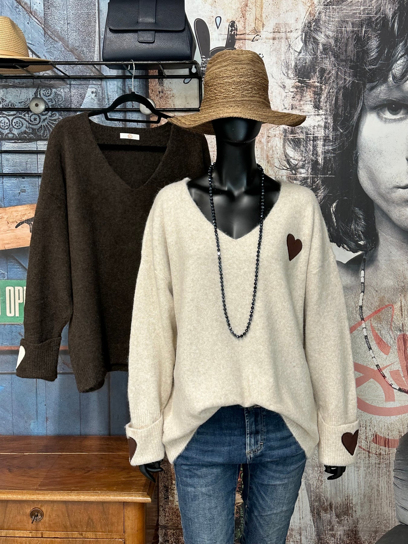 Mit diesem wunderschönen Pullover sorgen Sie für einen gemütlichen und trendigen Look. Weite, gerade Passform. Ultra-femininer V-Ausschnitt. Lange Ärmel mit auffälligem Detail: ein breiter, permanenter Saum, der für eine strukturierte und schicke Dicke am Handgelenk sorgt. Wunderschöner, weicher „Herz“-Aufnäher auf der Brust und am Saum auf beiden Seiten der Ärmel. Das perfekte Kleidungsstück für die kalte Jahreszeit.